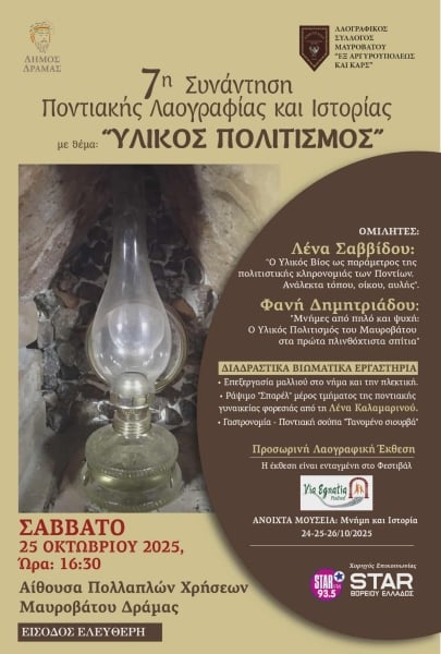 Τη δεύτερη μέρα, το Σάββατο 25 Οκτωβρίου, θα πραγματοποιηθεί η 7η Συνάντηση Ποντιακής Λαογραφίας και Ιστορίας με θέμα «Υλικός Πολιτισμός» στην αίθουσα πολλαπλών χρήσεων Μαυροβάτου Δράμας.