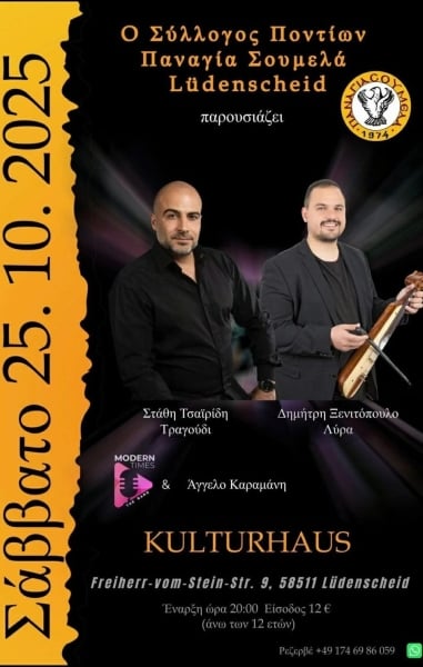 Ο Σύλλογος Ποντίων Παναγία Σουμελά Lüdenscheid διοργανώνει ποντιακό γλέντι, το Σάββατο 25 Οκτωβρίου, στις 20:00, στο Kulturhaus.