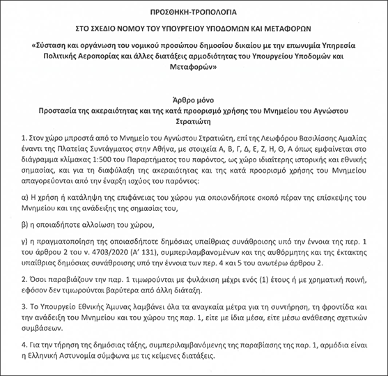 Κατατέθηκε στη Βουλή η τροπολογία για τη χρήση του χώρου του μνημείου του Άγνωστου Στρατιώτη. Η τροπολογία εντάσσεται στο νομοσχέδιο του υπουργείου Υποδομών και Μεταφορών για τη σύσταση και οργάνωση της Υπηρεσίας Πολιτικής Αεροπορίας, το οποίο εισάγεται αύριο στην ολομέλεια προς ψήφιση.