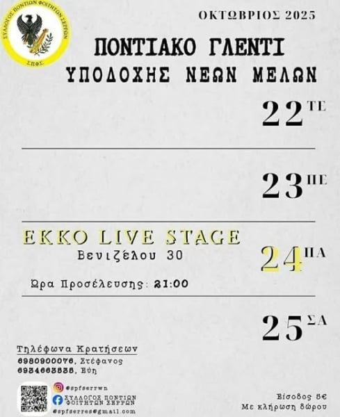 Ποντιακό γλέντι για την υποδοχή των νέων μελών οργανώνει την Παρασκευή 24 Οκτωβρίου ο Σύλλογος Ποντίων Φοιτητών Σερρών, στις 21:00.