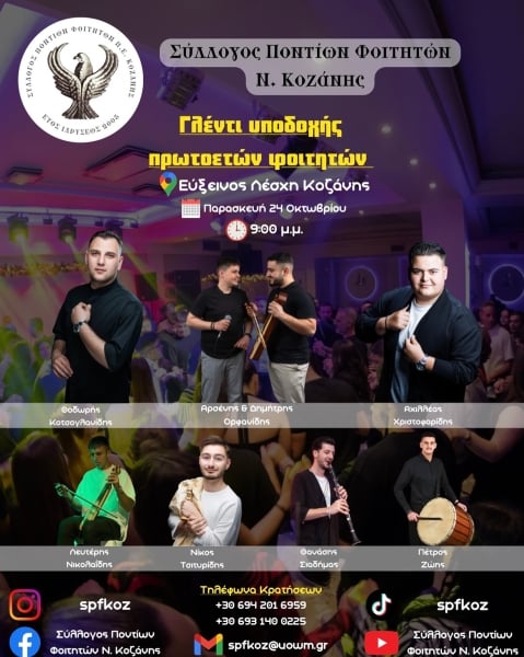 Ποντιακό γλέντι υποδοχής των πρωτοετών φοιτητών ετοιμάζει για αύριο, Παρασκευή 24 Οκτωβρίου ο Σύλλογος Ποντίων Φοιτητών Ν. Κοζάνης.