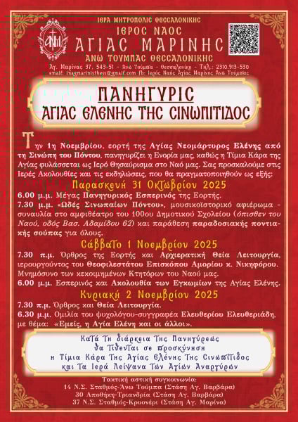 • Στις 19:30 θα λάβει χώρα στο αμφιθέατρο του 100ού Δημοτικού Σχολείου (όπισθεν του ναού, οδός Βασ. Αδαμίδου 62), για δεύτερη χρονιά, συναυλία με τον τίτλο «Ωδές Σινωπαίων Πόντου», ένα μουσικοϊστορικό αφιέρωμα μνήμης στον πολυθρύλητο Πόντο, τόπο καταγωγής της Αγίας και εκατοντάδων μαρτύρων και ηρώων. Τη συναυλία θα πλαισιώσουν διακεκριμένοι ερμηνευτές και μουσικοί, που θα μας ταξιδέψουν νοερά στις πατρογονικές εστίες των προγόνων μας. Προ της συναυλίας θα μοιραστεί παραδοσιακή ποντιακή σούπα σε όλους.