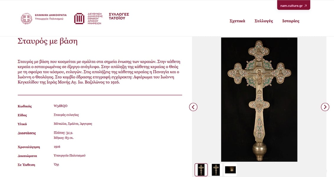 Η σελίδα του υπουργείου Πολιτισμού που αναφέρεται στο πολύτιμο κειμήλιο της μονής Βαζελώνος (πηγή: portal.culture.gov.gr)