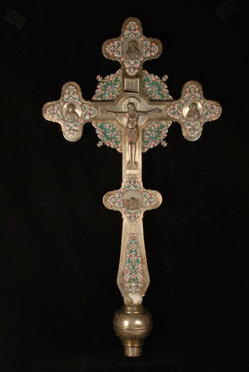 Από το μέγεθος του σταυρού αλλά και τη σφαιρική απόληξη του κομβίου (στο κάτω μέρος υπάρχει υποδοχή για κοντάρι) εξάγουμε το συμπέρασμα πως πρόκειται για σταυρό λιτανείας (ήταν σταυρός που κρατούσαν τα εξαπτέρυγα-παπαδάκια στις λιτανείες). Ο σταυρός είναι ρωσικής προέλευσης, όπως αποδεικνύεται από την τεχνοτροπία αλλά και από τη σλαβονική επιγραφή («titulus» IHUI=ΙΝΒΙ).