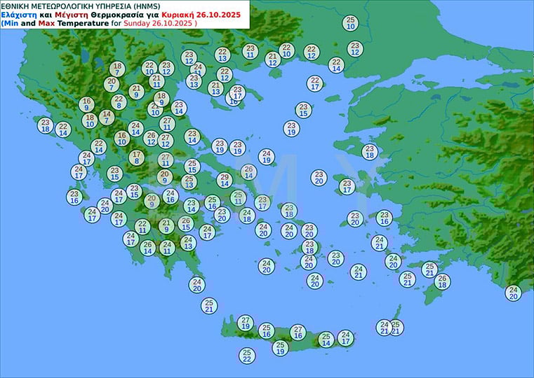 Θερμοκρασία: Από 17 έως 24-25 και τοπικά στην Κρήτη 27-28 βαθμούς Κελσίου.
