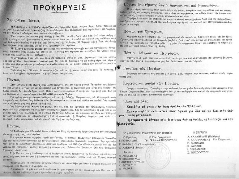 Την προκήρυξη υπογράφουν επιφανείς Πόντιοι της εποχής, ενώ μέλος της επιτροπής που δημιουργήθηκε ήταν και ο οπλαρχηγός Ευάγγελος Ιωαννίδης, ένα από τα σημαντικότερα στελέχη του αντάρτικου στον Πόντο.