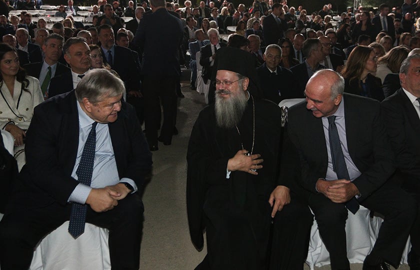 Ο Ευάγγελος Βενιζέλος, ο εκπρόσωπος του Αρχιεπισκόπου Ιερώνυμου, επίσκοπος Επιδαύρου Νικόδημος, και ο Ευάγγελος Μεϊμαράκης (φωτ.: EUROKINISSI / Χρήστος Μπόνης)