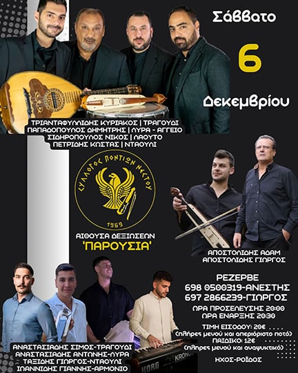Το μεγάλο ποντιακό γεγονός της περιοχής θα γίνει το Σάββατο 6 Δεκεμβρίου στην αίθουσα δεξιώσεων «Παρουσία» (5ο χλμ Χρυσούπολης-Ξάνθης), με τη συμμετοχή πολλών Πόντιων μουσικών.