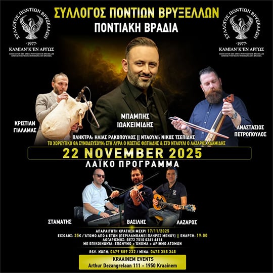 Μεγάλο ποντιακό και λαϊκό γλέντι ετοιμάζει ο Σύλλογος Ποντίων Βρυξελλών «Καμίαν ‘κ’ έν’ αργώς» για τον ετήσιο χορό του το Σάββατο 22 Νοεμβρίου, καιοι μουσικοί που θα συμμετάσχουν εγγυώνται την επιτυχία της βραδιάς: