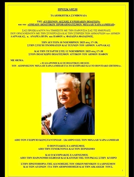 Τα Διοικητικά Συμβούλια της Ευξείνου Λέσχης Ευρωπαίων Πολιτών και του Ομίλου Πολιτικού Προβληματισμού «Μιχάλη Χαραλαμπίδη» διοργανώνουν δύο ημερίδες με θέμα Η διαδρομή και οι πολιτικές θέσεις του αείμνηστου Μιχάλη Χαραλαμπίδη για το Κυπριακό και το Ποντιακό Ζήτημα στην Λάρνακα και την Πάφο.