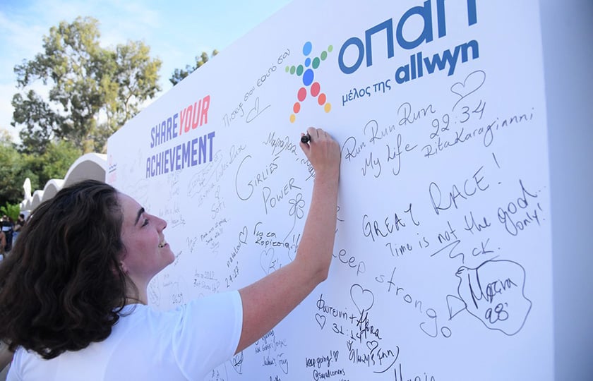 Μετά τον τερματισμό, ένας λευκός πίνακας τις περίμενε για να αποτυπώσουν το προσωπικό τους μήνυμα – λέξεις που εξέφραζαν τη χαρά, τη δύναμη και τον σκοπό της συμμετοχής τους.