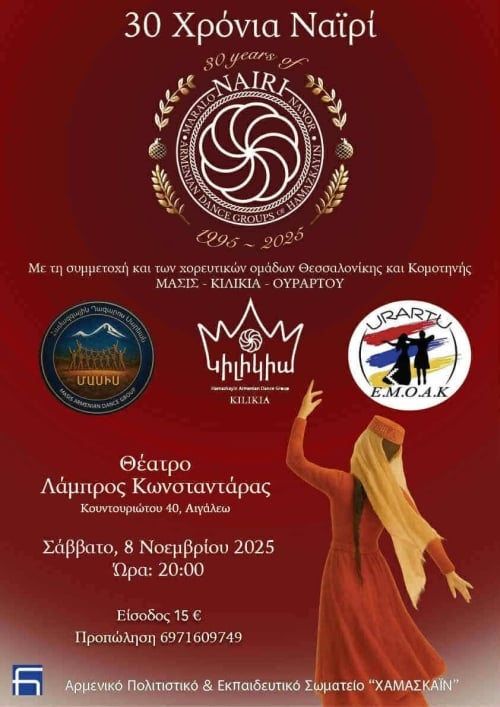Το Αρμενικό Πολιτιστικό & Εκπαιδευτικό Σωματείο «ΧΑΜΑΣΚΑΪΝ» διοργανώνει, το Σάββατο 8 Νοεμβρίου, στις 20:00, βραδιά αρμενικών χορών με την ευκαιρία συμπλήρωσης 30 χρόνων ζωής της χορευτικής ομάδας Ναϊρί στην Αθήνα.