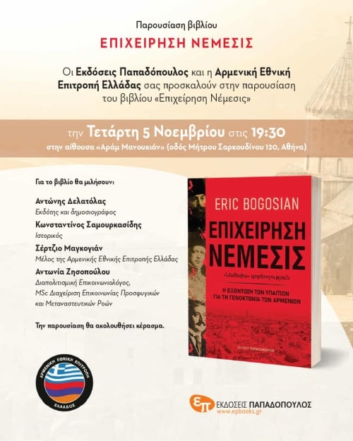 Η Αρμενική Εθνική Επιτροπή Ελλάδας και οι εκδ. Παπαδόπουλος παρουσιάζουν την Τετάρτη 5 Νοεμβρίου, στις 19:30, στην παρουσίαση του βιβλίου Επιχείρηση Νέμεσις στην αίθουσα «Αράμ Μανουκιάν», στην Αθήνα. Για το βιβλίο θα μιλήσουν οι: