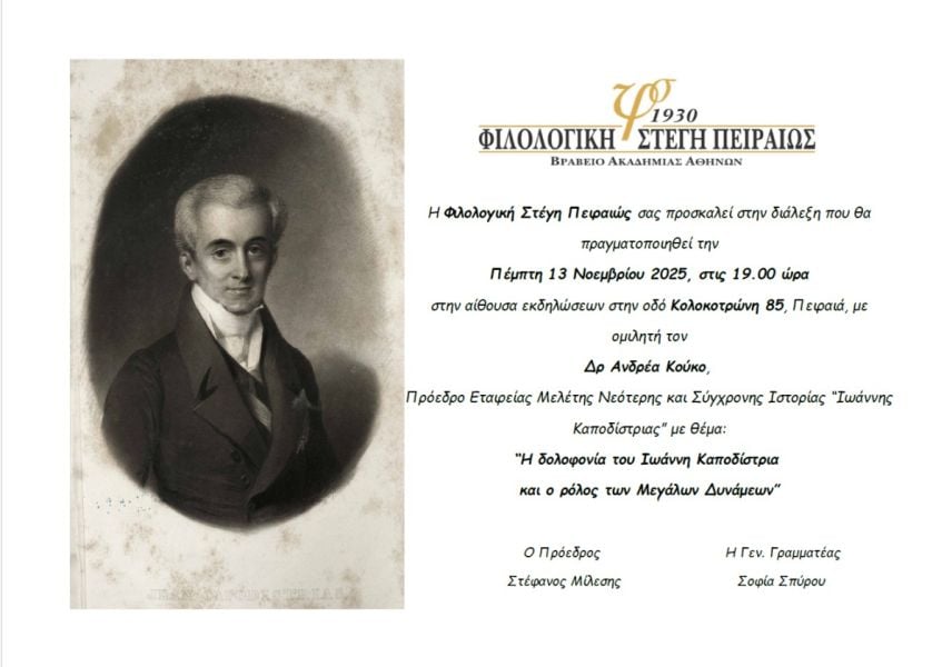 Η Φιλολογική Στέγη Πειραιώς διοργανώνει, την Πέμπτη 13 Νοεμβρίου, στις 19:00, εκδήλωση με θέμα Η δολοφονία του Ιωάννη Καποδίστρια και ο ρόλος των Μεγάλων Δυνάμεων.