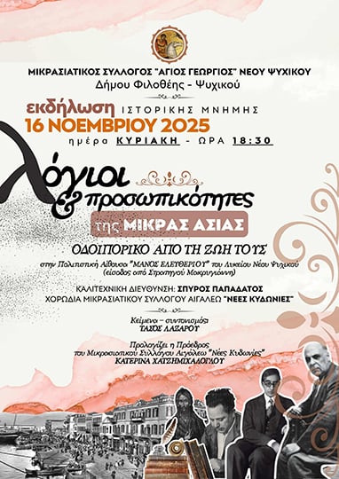 Ο Μικρασιατικός Σύλλογος «Άγιος Γεώργιος» Νέου Ψυχικού, σε συνδιοργάνωση με τον Μικρασιατικό Σύλλογο «Νέες Κυδωνίες» Αιγάλεω, προσκαλούν στην εκδήλωση ιστορικής μνήμης «Λόγιοι και προσωπικότητες της Μικράς Ασίας – Οδοιπορικό από τη ζωή τους».