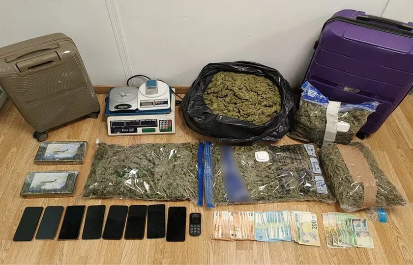 Κατά τις έρευνες βρέθηκαν και κατασχέθηκαν: 2.238 γρ. κοκαΐνης, 9.092,6 γρ. ακατέργαστης κάνναβης, 14 φαρμακευτικά σκευάσματα, 9 κινητά, 4 ζυγαριές ακριβείας, jammer, 4 Ι.Χ. και συνολικά 28.880 ευρώ/λεκ. Το παράνομο όφελος υπολογίζεται σε τουλάχιστον 105.000 ευρώ.
