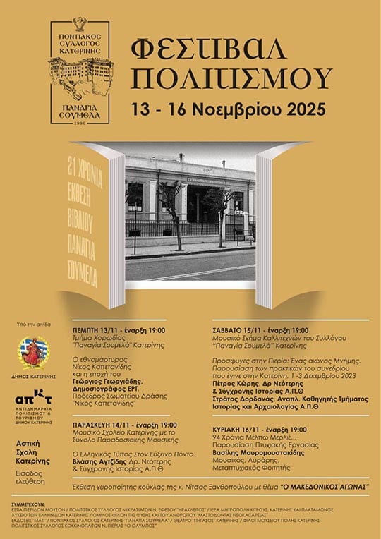 Με ιστορία και ποντιακή παράδοση θα γεμίζει κάθε απόγευμα μέχρι την Κυριακή η Αστική Σχολή Κατερίνης – στο Φεστιβάλ Πολιτισμού του Συλλόγου «Παναγία Σουμελά», υπό την αιγίδα του Δήμου Κατερίνης.