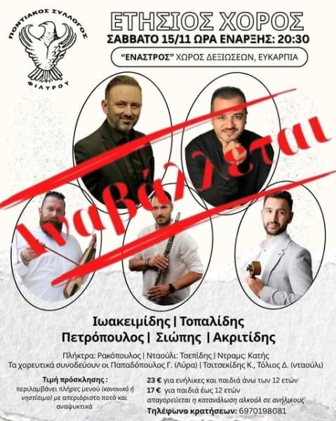 Στην αναβολή του ετήσιου χορού που είχε προγραμματιστεί για αύριο, Σάββατο, προχώρησε ο Ποντιακός Σύλλογος Φιλύρου.