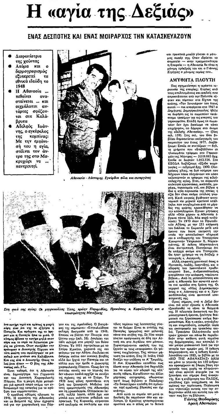 Το 1980 η εφημερίδα Ριζοσπάστης δημοσιεύει φωτογραφία της Αθανασίας με υπουργό της τότε κυβέρνησης, αλλά και έναν κατάλογο των πολιτικών της φίλων, ο οποίος συμπεριλαμβάνει υπουργούς, υφυπουργούς, μητροπολίτες, διοικητές οργανισμών και δικαστικούς λειτουργούς.