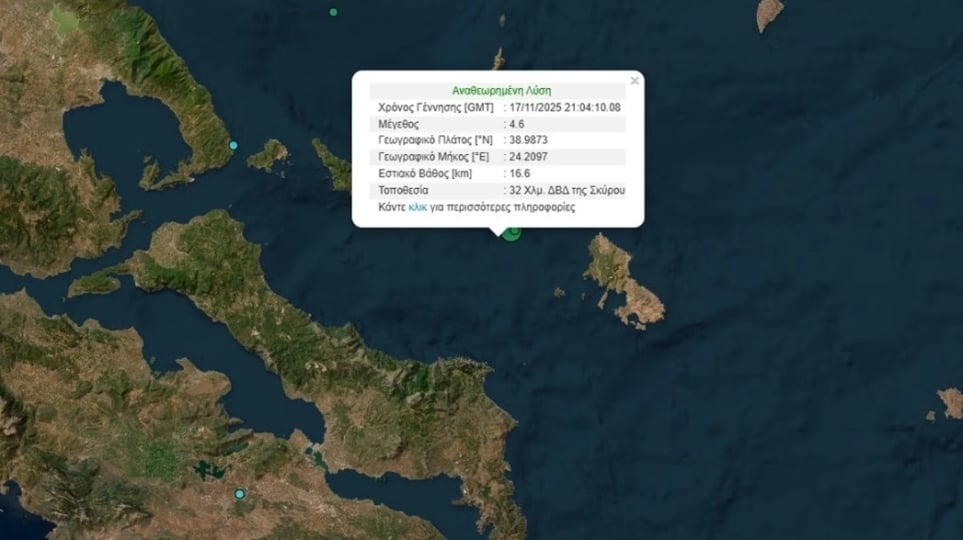 Σεισμική δόνηση μεγέθους 4,6 βαθμών της κλίμακας Ρίχτερ σημειώθηκε στις 23:04 ώρα Ελλάδας, ανοιχτά της Σκύρου, ενώ έγινε αισθητή σε αρκετές περιοχές της Αθήνας.