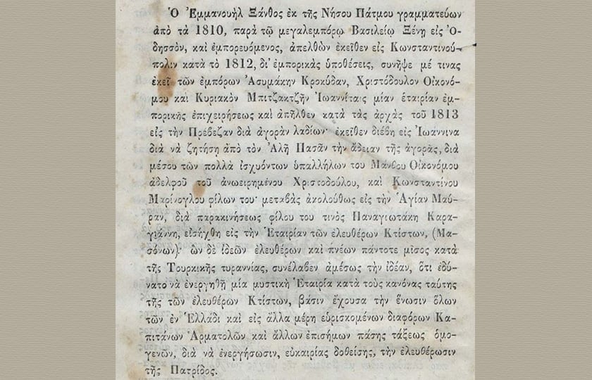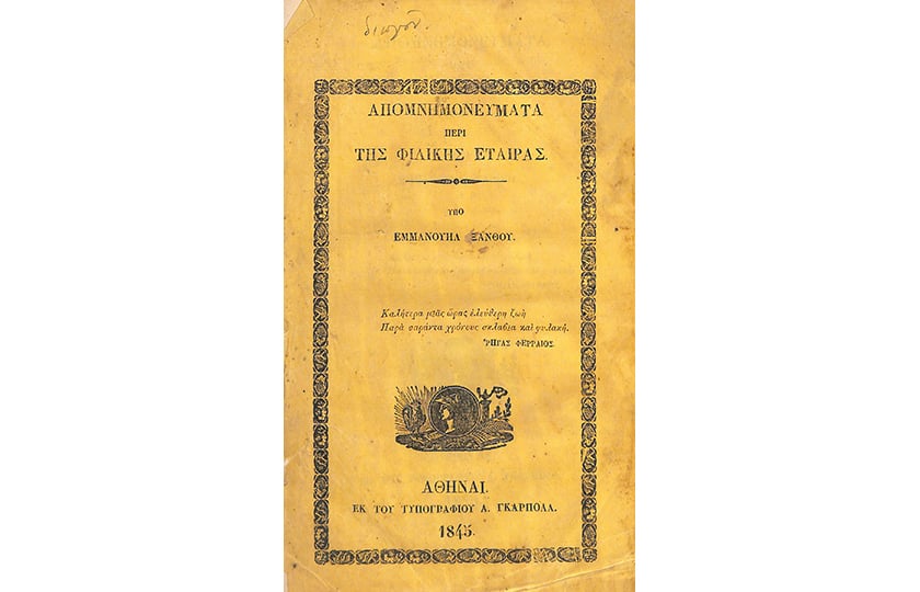 Έξι χρόνια πριν φύγει από τη ζωή, το 1845, ο Ξάνθος δημοσίευσε τα πολύτιμα Απομνημονεύματά του– τη μοναδική λεπτομερή καταγραφή από ιδρυτή της Φιλικής Εταιρείας.