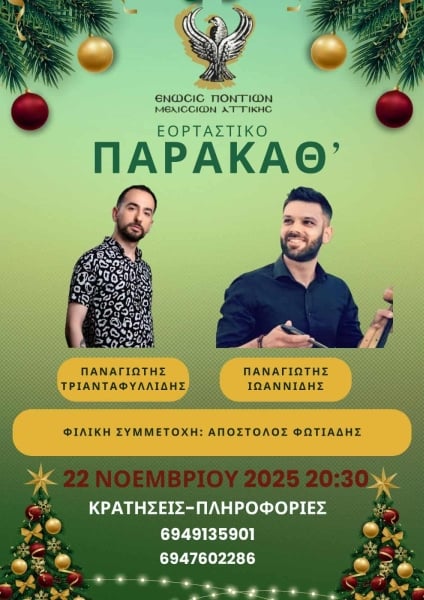 Εορταστικό παρακάθ’ γεμάτο μουσική, χορό και παράδοση οργανώνει το Σάββατο 22 Νοεμβρίου η Ένωσις Ποντίων Μελισσίων Αττικής.
