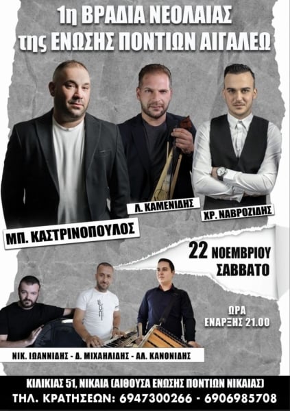 Την πρώτη βραδιά νεολαίας οργανώνει το Σάββατο 22 Νοεμβρίου η Ένωση Ποντίων Αιγάλεω.