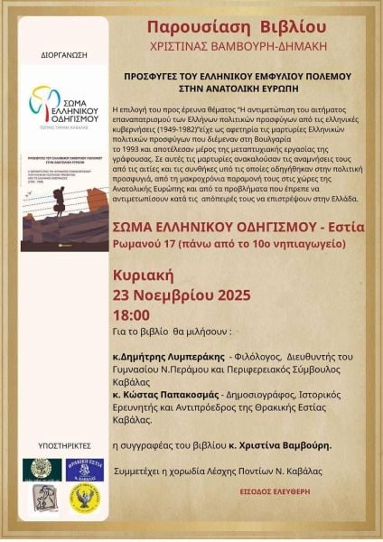 Το Σώμα Ελληνικού Οδηγισμού (Τοπικό Τμήμα Καβάλας) παρουσιάζει, την Κυριακή 23 Νοεμβρίου, στις 18:00, το βιβλίο Πρόσφυγες του ελληνικού εμφυλίου πολέμου στην Ανατολική Ευρώπη της Χριστίνας Βαμβούρη-Δημάκη.