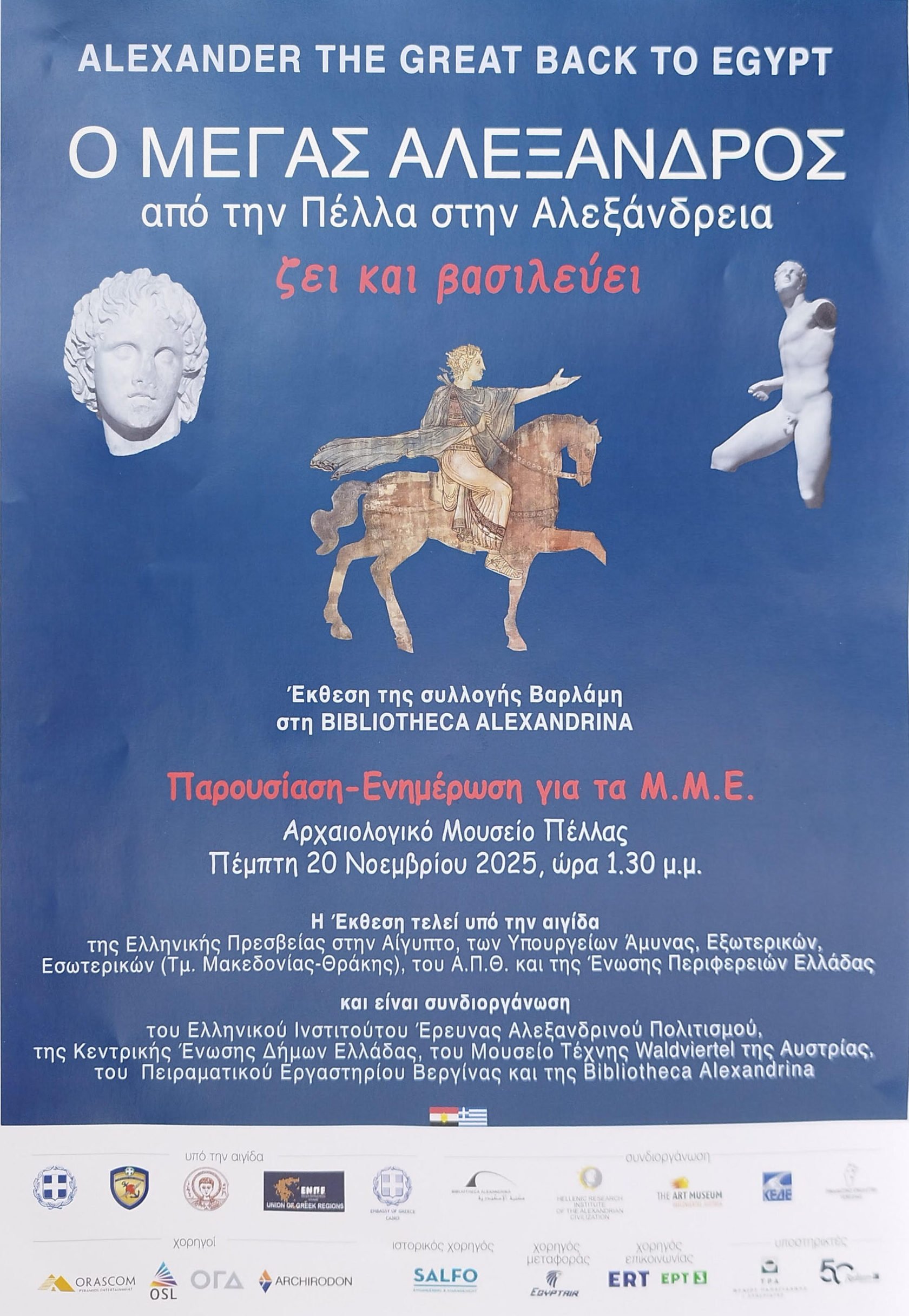 Η ανακοίνωση της έκθεσης έγινε στο Αρχαιολογικό Μουσείο Πέλλας, όπου η προϊσταμένη της Εφορείας Αρχαιοτήτων, Ελισάβετ Τσιγαρίδα, υπογράμμισε πως η αρχαία Πέλλα συνδέθηκε με τη Βόρεια Αφρική και την Ασία, δημιουργώντας «υπόστρωμα συμπερίληψης» που «δεν θα υπήρχε χωρίς τον Αλέξανδρο». Η ίδια σημείωσε ότι η έκθεση ενώνει «δύο μεγάλους πολιτισμούς» και αναφέρθηκε στην πρόοδο των έργων για τα εγκαίνια του Ανακτόρου της Πέλλας, «του σπιτιού του Αλεξάνδρου».