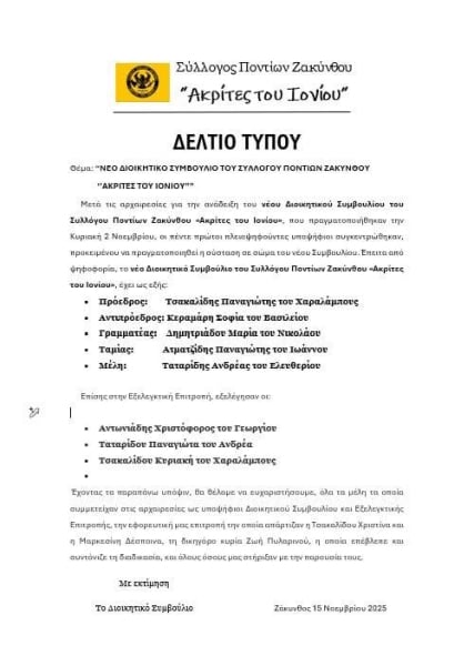Μερικούς μήνες μετά την έγκριση του Πρωτοδικείου Ζακύνθου για τη λειτουργία του, ο Σύλλογος Ποντίων «Ακρίτες του Ιονίου» έχει πλέον και επίσημα Διοικητικό Συμβούλιο. Οι αρχαιρεσίες έγιναν στις 2 Νοεμβρίου και οι πέντε πλειοψηφούντες υποψήφιοι συγκροτήθηκαν σε Σώμα. Η σύνθεση του ΔΣ που προέκυψε, είναι η εξής: