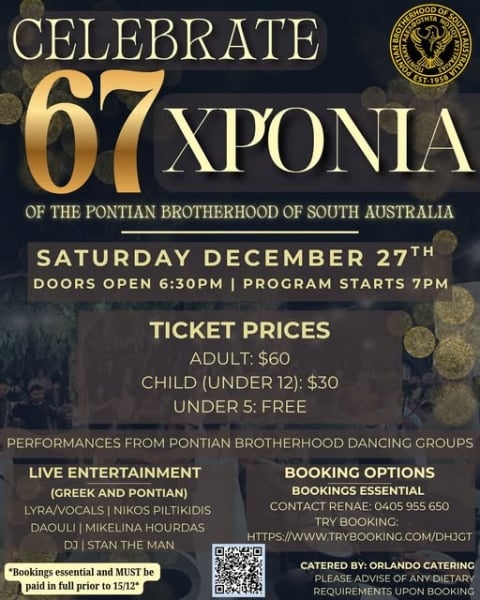 Μια βραδιά γεμάτη ποντιακή παράδοση, μουσική και χορό ετοιμάζει για το Σάββατο 27 Δεκεμβρίου η Ποντιακή Αδελφότητα Νότιας Αυστραλίας, καθώς τιμά 67 χρόνια ιστορίας, πολιτισμού και παρουσίας στην ελληνική ομογένεια. Η βραδιά θα συνδυάζει ζωντανή ελληνική και ποντιακή διασκέδαση με τους Νίκο Πιλτικίδη στη λύρα και το τραγούδι, τη Μικελίνα Χούρδα στο νταούλι και τον DJ Stan The Man που θα κρατήσει ζωντανή την πίστα όλη νύχτα!