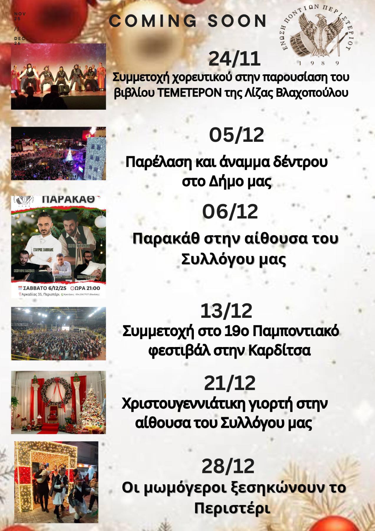 Η Ένωση Ποντίων Περιστερίου μπαίνει δυναμικά στο πνεύμα των γιορτών, παρουσιάζοντας ένα πολυδιάστατο πρόγραμμα εκδηλώσεων που τιμά την παράδοση και ενισχύει τη συνοχή της ποντιακής κοινότητας.