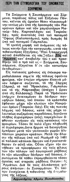 Το 1936, όμως, στα Ποντιακά Φύλλα δημοσιεύεται η πρόταση του αρχιμανδρίτη Αβραάμ Παπαδόπουλου (1855-1939 – γεννημένος στην Τσίτη, υπήρξε ο πρώτος ιερέας των Σουρμένων με γυμνασιακή μόρφωση, και συγγραφέας του έργου Στατιστική της Επαρχίας Σουρμένων [Τραπεζούντα 1881, Αθήνα 21938]).