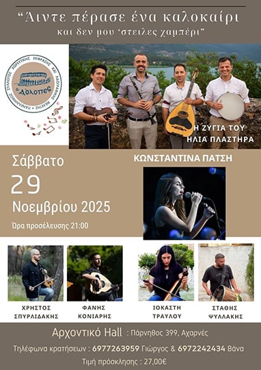 Ένα αυθεντικό παραδοσιακό γλέντι διοργανώνει το Σάββατο 29 Νοεμβρίου ο Πανελλήνιος Σύλλογος Χορευτικής Έκφρασης & Λαογραφικής Μελέτης «Οι Δόλοπες» στο Αρχοντικό Hall (Πάρνηθος 399, Αχαρνές).