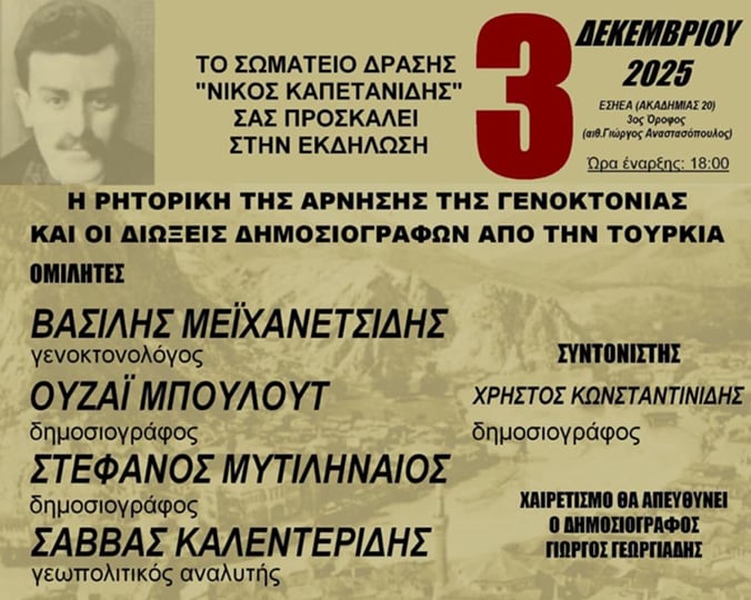 Εκδήλωση με θέμα «Η ρητορική της άρνησης της Γενοκτονίας και οι διώξεις δημοσιογράφων από την Τουρκία» διοργανώνει το Σωματείο Δράσης «Νίκος Καπετανίδης» την Τετάρτη 3 Δεκεμβρίου, στις 18:00, στην αίθουσα «Γεώργιος Αναστασόπουλος» της ΕΣΗΕΑ (Ακαδημίας 20, Αθήνα).