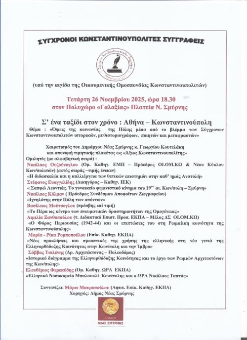 Στην εκδήλωση με τίτλο «Σ’ ένα ταξίδι στον χρόνο: Αθήνα-Κωνσταντινούπολη» που γίνεται υπό την αιγίδα της Οικουμενικής Ομοσπονδίας Κωνσταντινουπολιτών (ΟΙΟΜΚΩ), θα χαιρετίσει ο δήμαρχος Νέας Σμύρνης Γεώργιος Κουτελάκης.