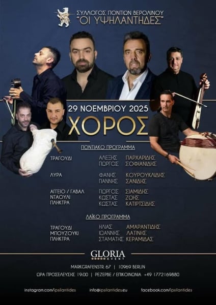 Ποντιακά και λαϊκά θα γλεντήσουν το Σάββατο 29 Νοεμβρίου τα μέλη του Συλλόγου Ποντίων Βερολίνου «Οι Υψηλάντηδες» στον χορό που ετοιμάζουν.