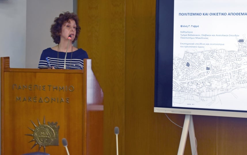 Η καθηγήτρια του Τμήματος Βαλκανικών, Σλαβικών και Ανατολικών Σπουδών και Αναπληρώτρια πρόεδρος του τμήματος Ελένη Γαβρά παρουσίασε την πρώτη εισήγηση με θέμα Πολιτισμικό και Οικιστικό Απόθεμα των Ελληνικών Κοινοτήτων της Μικράς Ασίας.