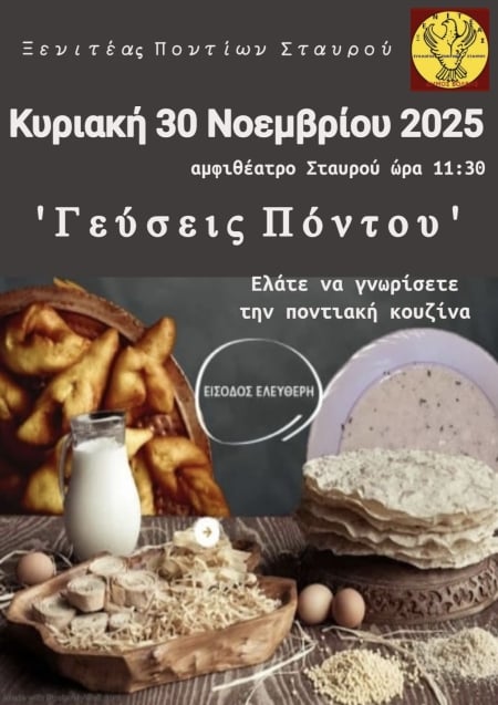 Εάν είστε από τους λίγους που δεν έχουν ακόμα δοκιμάσει τι εστί «ποντιακή κουζίνα» ή αντίθετα είστε από εκείνους που προτιμούν μόνο ποντιακές νοστιμιές, ο Συλλόγου Ποντίων Σταυρού «Ξενιτέας» και οι «φίλοι» του σας προσκαλούν σ’ ένα ταξίδι με «Γεύσεις Πόντου».