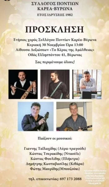 Τον ετήσιο χορό του οργανώνει το μεσημέρι της Κυριακή 30 Νοεμβρίου ο Σύλλογος Ποντίων Καρέα-Βύρωνα, στην αίθουσα δεξιώσεων «Το Κέρας της Αμάλθειας (Ελλησπόντου 41, Βύρωνας), στις 13:00.