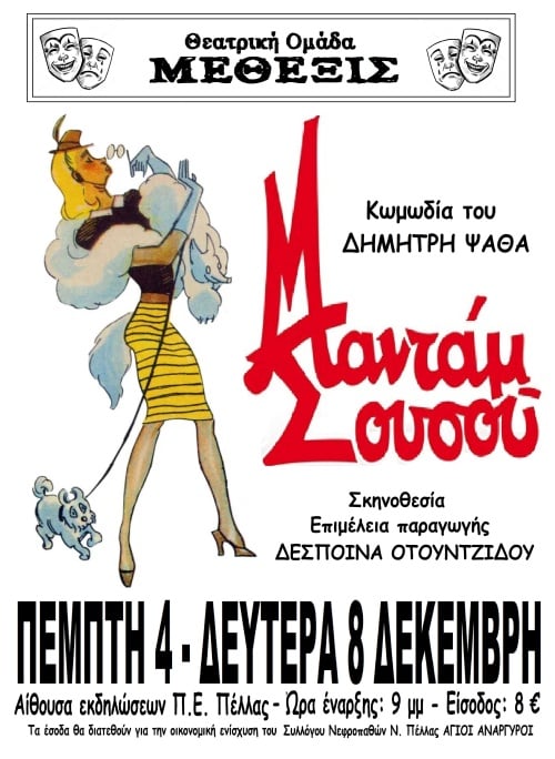 »Ακόμη το Ζητείται Ψεύτης που παίχτηκε τον Οκτώβριο από την Θεατρική Ομάδα Βριλησσίων για την ενίσχυση του Συλλόγου Ατόμων με Νοητική Στέρηση “ΑΓΑΠΗ ΚΑΙ ΦΡΟΝΤΙΔΑ” και τώρα η Μαντάμ Σουσού που θα παιχτεί από την θεατρική ομάδα “ΜΕΘΕΞΙΣ” της Δέσποινας Οτουντζίδου στην Έδεσσα για την ενίσχυση του Συλλόγου Νεφροπαθών Πέλλας “ΑΓΙΟΙ ΑΝΑΡΓΥΡΟΙ”» δήλωσε η Λένα Νίτσου-Ψαθά.