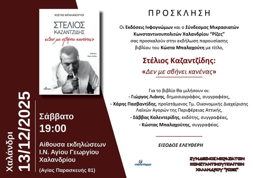 Ο Σύνδεσμος Μικρασιατών Κωνσταντινουπολιτών Χαλανδρίου «Ρίζες» και οι Εκδόσεις Ινφογνώμων παρουσιάζουν, το Σάββατο 13 Δεκεμβρίου, στις 19:00, το βιβλίο Στέλιος Καζαντζίδης: Δεν με σβήνει κανένας του Κώστα Μπαλαχούτη.