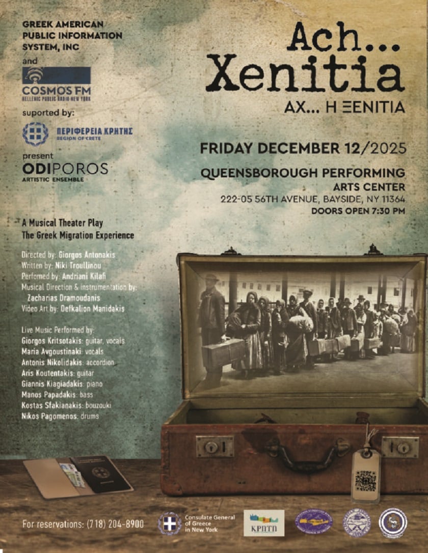 Η καρδιά της ελληνικής μετανάστευσης χτυπά φέτος στη Νέα Υόρκη, όπου το Ελληνικό Κοινωφελές Ραδιόφωνο COSMOS FM και ο οργανισμός GAEPIS, σε σύμπραξη με την περιφέρεια Κρήτης, παρουσιάζουν την ομάδα ΩΔΗπόρος σε μια παράσταση που υμνεί τη διαχρονική περιπέτεια της ξενιτιάς. Την Παρασκευή 12 Δεκεμβρίου, στις 7:30 μ.μ., το Queensborough Performing Arts Center θα φιλοξενήσει τη μουσικοθεατρική δημιουργία «Αχ, η Ξενιτιά», ένα έργο που φωτίζει το μεγάλο ελληνικό ταξίδι από τα πρώτα μεταναστευτικά κύματα μέχρι σήμερα.
