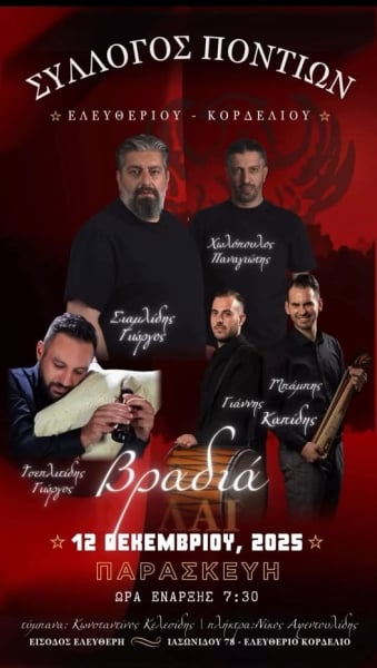 Βραδιά νεολαίας οργανώνει την Παρασκευή 12 Δεκεμβρίου ο Σύλλογος Ποντίων Ελευθερίου-Κορδελιού.