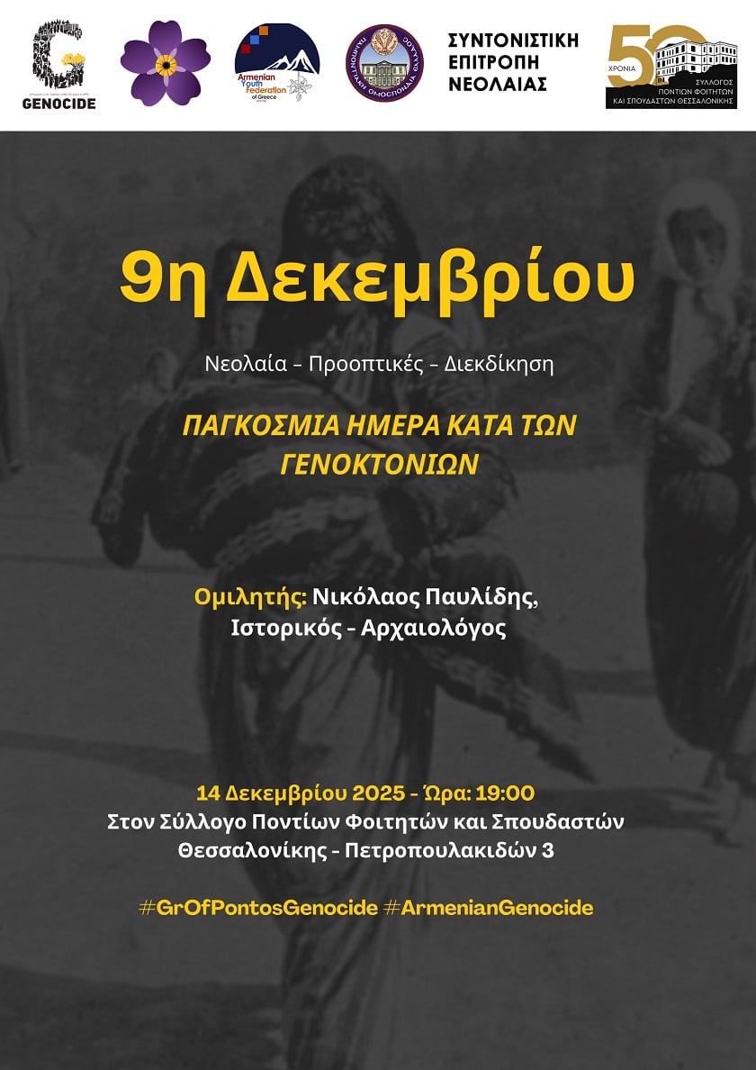 Μια εκδήλωση ιστορικής μνήμης και συλλογικού χρέους θα διεξαχθεί την Κυριακή 14 Δεκεμβρίου στις 19:00, στο χώρο του Συλλόγου Ποντίων Φοιτητών & Σπουδαστών Θεσσαλονίκης, στην οδό Πετροπουλάκηδων 3. Η εκδήλωση, καρπός της συνεργασίας της Αρμενικής Νεολαίας Ελλάδας, της Συντονιστικής Επιτροπής Νεολαίας της ΠΟΕ και του Συλλόγου Ποντίων Φοιτητών & Σπουδαστών Θεσσαλονίκης, έρχεται να φωτίσει ένα σκοτεινό κεφάλαιο της ανθρώπινης ιστορίας, ένα κεφάλαιο που ακόμη αιμορραγεί.