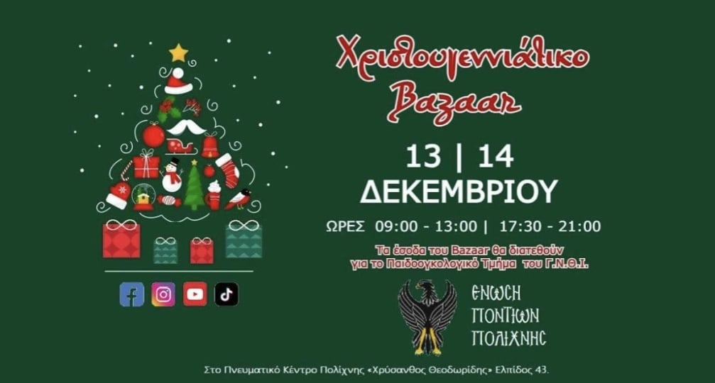 «Τα Χριστούγεννα δεν είναι μια απλή γιορτή… είναι μία γιορτή αγάπης! Γι’ αυτό σας περιμένουμε όλους στο Χριστουγεννιάτικο bazaar που διοργανώνει η Ένωση Ποντίων Πολίχνης, ώστε να στείλουμε το δικό μας μήνυμα αγάπης στα παιδιά που έχουν ανάγκη!