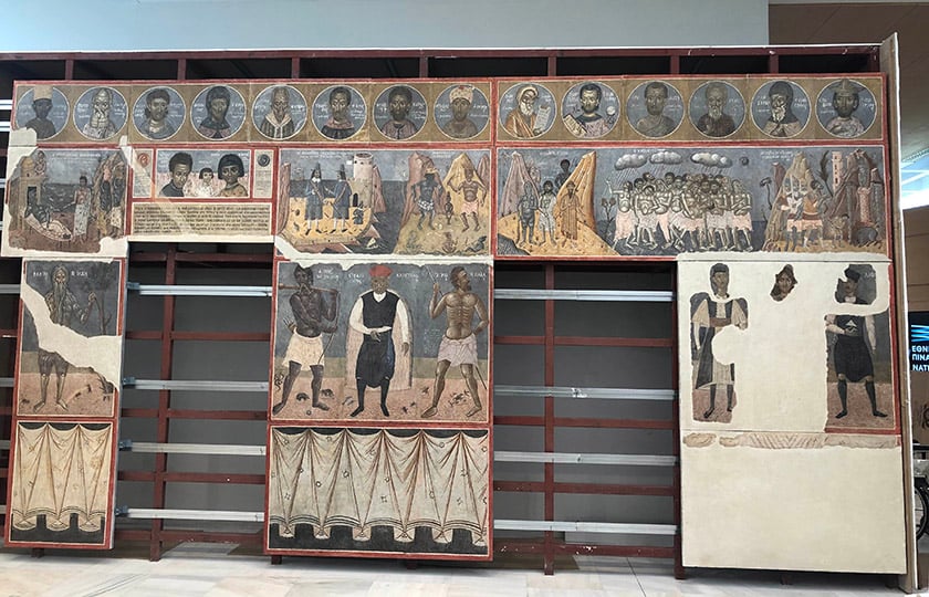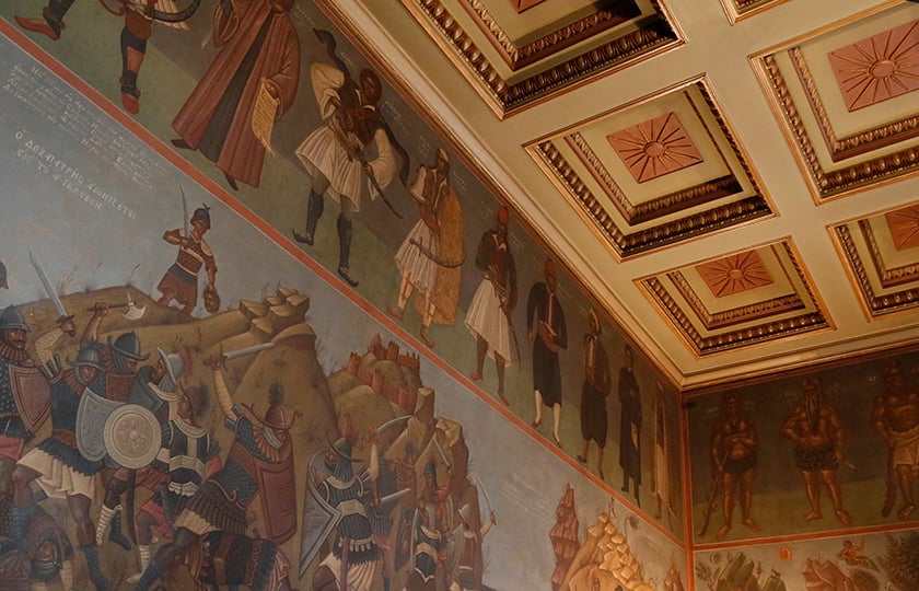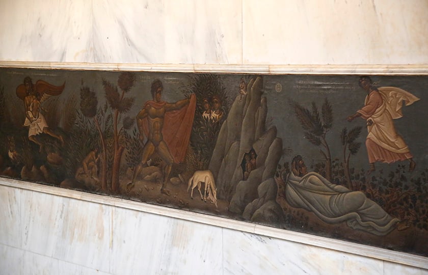 Και ρίχνεται στη δουλειά με πάθος. Δεν κάνει «διακοσμησούλες». Θέλει να ιστορήσει, όπως λέει, «το ενιαίο της φυλής». Στήνει μια πομπή μορφών, από τον Θησέα ως τον Κολοκοτρώνη. Εξήντα πέντε μορφές, μια Ελλάδα σε τοίχους: μύθος, ιστορία, πρόσωπα-σύμβολα. Έργο που απαιτεί χρόνο, κόπο, πειθαρχία και νεύρο.
