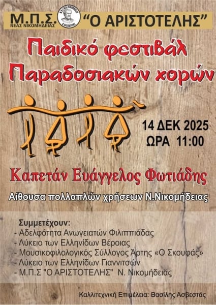 Το φεστιβάλ θα πραγματοποιηθεί στην αίθουσα πολλαπλών χρήσεων της Νέας Νικομήδειας, από τις 11 το πρωί, και θα συμμετέχουν η Αδελφότητα Ανωγειατών Φιλιππιάδας, το Λύκειο Ελληνίδων Βέροιας, ο Μουσικοφιλολογικός Σύλλογος Άρτης «Ο Σκουφάς», το Λύκειο Ελληνίδων Γιαννιτσών, καθώς και τα παιδικά τμήματα του «Αριστοτέλη».