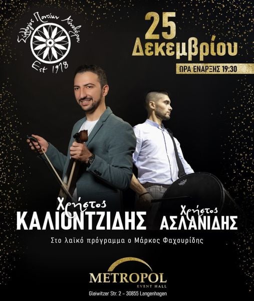 Ειδικά για το χριστουγεννιάτικο γλέντι του ομογενειακού Συλλόγου θα παίξουν οι Χρήστος Καλιοντζίδης (τραγούδι, ποντιακή λύρα) και Χρήστος Ασλανίδης (νταούλι) ενώ στο λαϊκό πρόγραμμα θα είναι ο Μάρκος Φαχουρίδης.