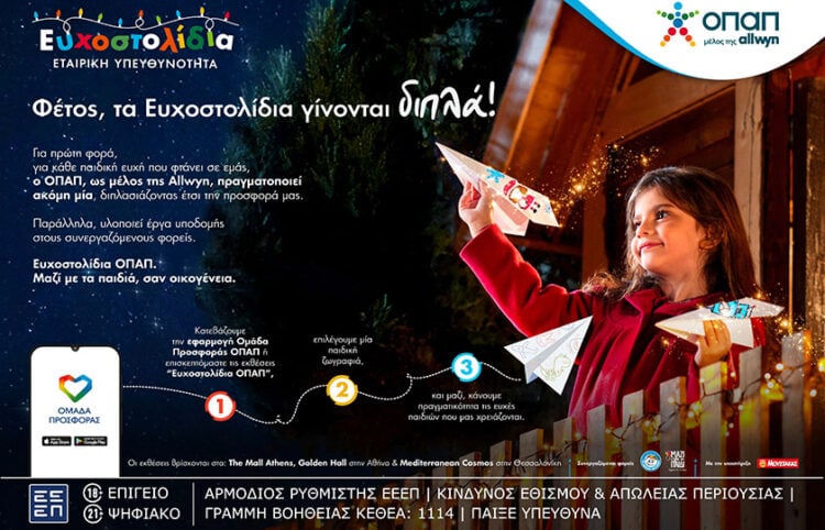 Εφέτος μάλιστα, ο ΟΠΑΠ, μέλος της Allwyn, διπλασιάζει τη χαρά, πραγματοποιώντας ακόμη μία ευχή για κάθε μία που εκπληρώνουμε εμείς.